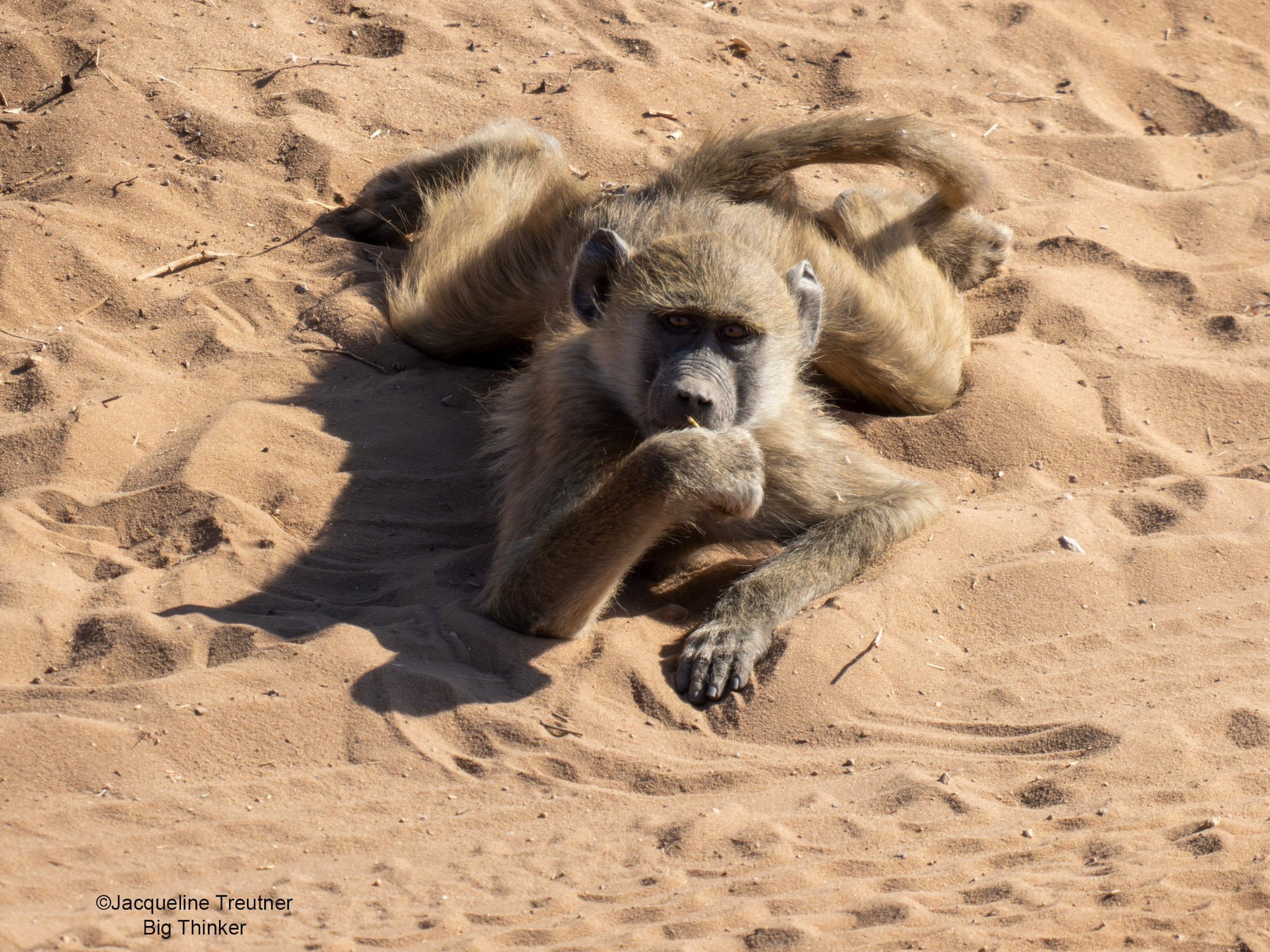 Un babouin au Botswana se détend dans le sable chaud, perdu dans ses propres pensées. «Qu’est-ce que pour le dîner ce soir? Peut-être des fruits délicieux?