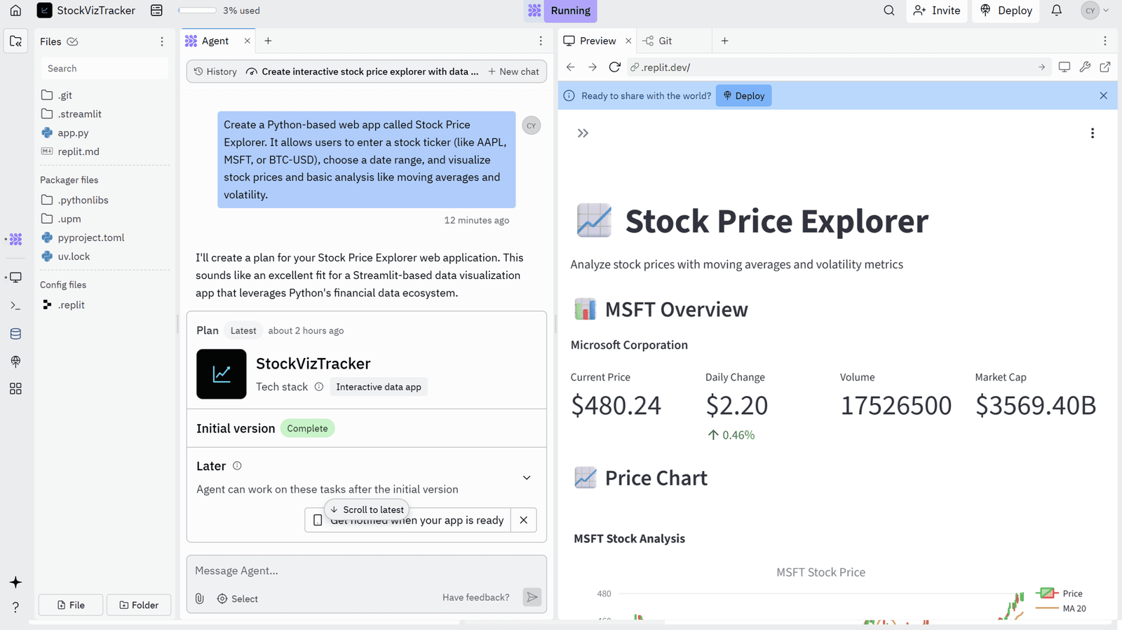 Alternativement, vous pouvez choisir d’approuver le plan et commencer à créer l’application. Attendez un certain temps jusqu’à ce que l’agent termine le développement de la demande. Vous pouvez choisir de recevoir une notification lorsque l’application est prête soit en installant l’application Replit ou en visitant simplement le tableau de bord.