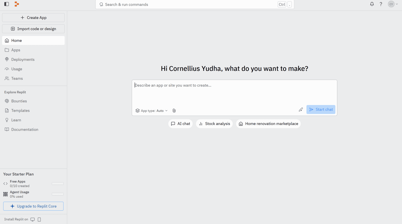 Travaillons sur la création d’un explorateur de cours d’action simple à l’aide de Replit. Tout d’abord, inscrivez-vous et accédez à la page d’accueil, qui devrait ressembler à l’image ci-dessous.