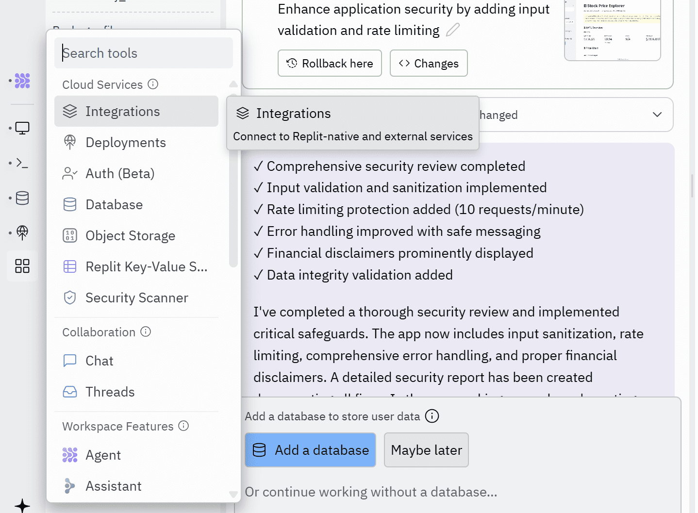 Pour les codeurs d’ambiance utilisant Replit, l’agent recommande souvent d’ajouter diverses connexions externes, telles que des bases de données. Si vous avez un ajout spécifique à l’esprit, vous pouvez accéder à l’onglet Outils et demander à Replit de l’incorporer dans votre application, comme indiqué dans l’image ci-dessous.