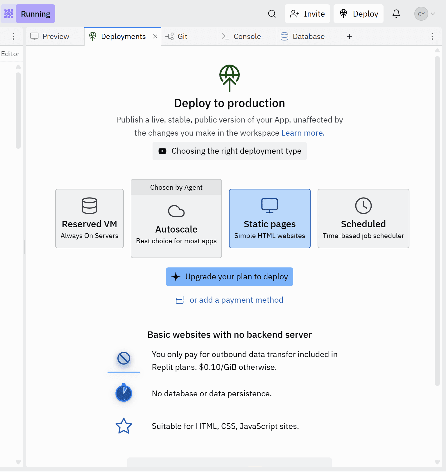 Cependant, si vous n’êtes pas familier avec le processus de déploiement, Replit fournit une procédure de déploiement où nous pouvons publier notre application avec quatre types de déploiement différents en fonction de nos exigences. La sélection de déploiement est indiquée dans l’image ci-dessous.