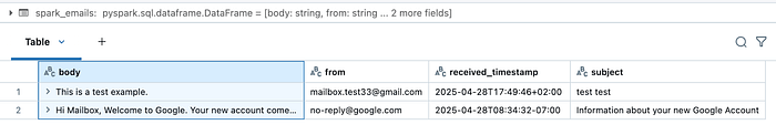 Une fois que nous avons authentifié, nous pouvons lire les e-mails de Gmail à l’aide de la fonction suivante, enregistrer les informations par e-mail dans une étincelle Dataframeet finalement à une table delta: