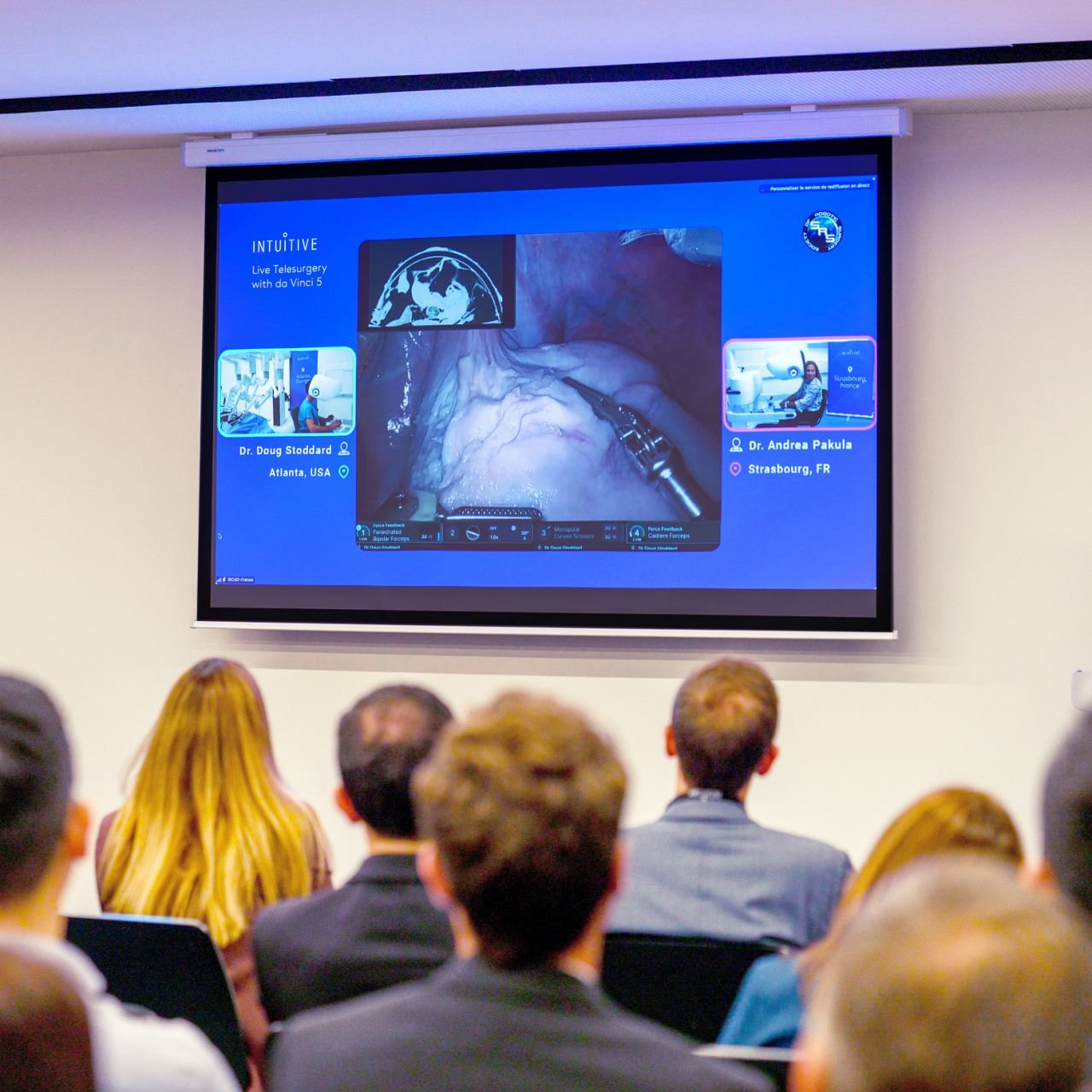 Société des participants à la chirurgie robotique qui regardent une démo en direct de la chirurgie intuitive. | Crédit: chirurgie intuitive