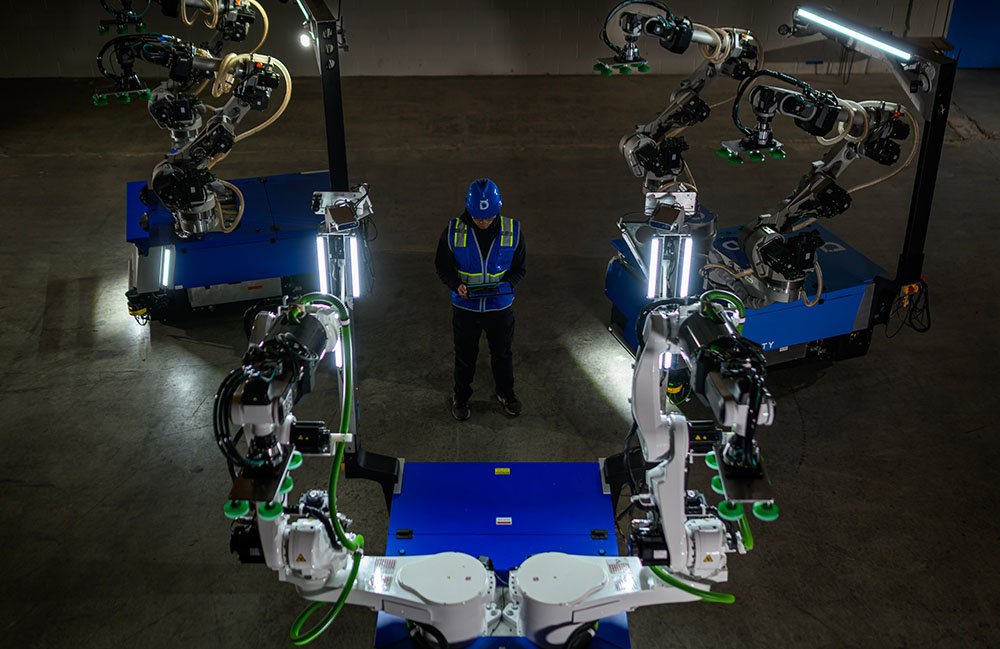 Le robot armé du mech de la dextérité devant un travailleur dans un hardhat bleu. L'entreprise travaille avec Sanmina sur la fabrication.