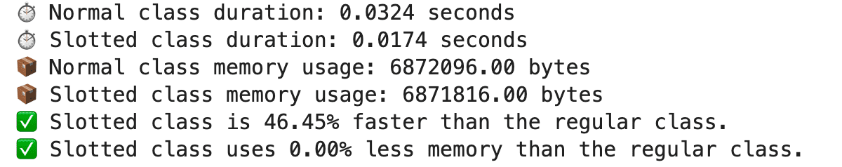 print(f"✅ Slotted ML class uses {percent_smaller:.2f}% less memory than the regular ML class.")