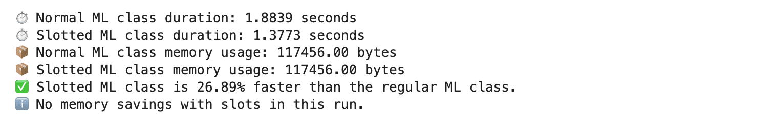 print(f"✅ Slotted ML class is {percent_faster:.2f}% faster than the regular ML class.")
