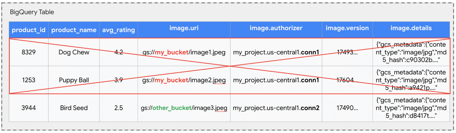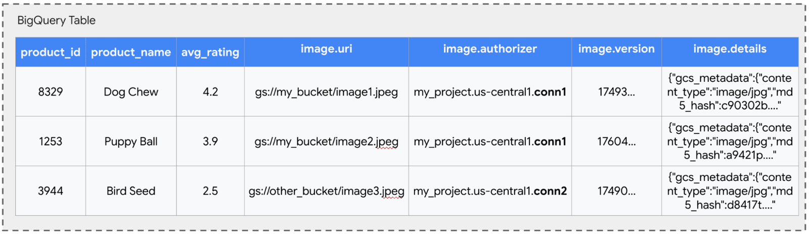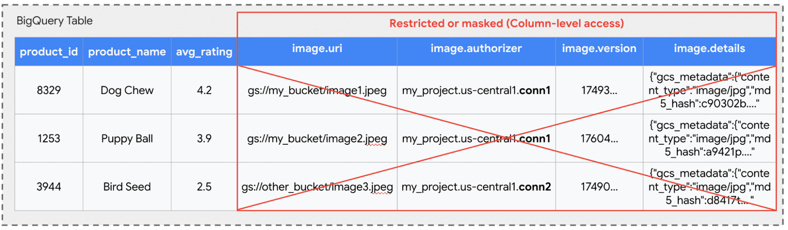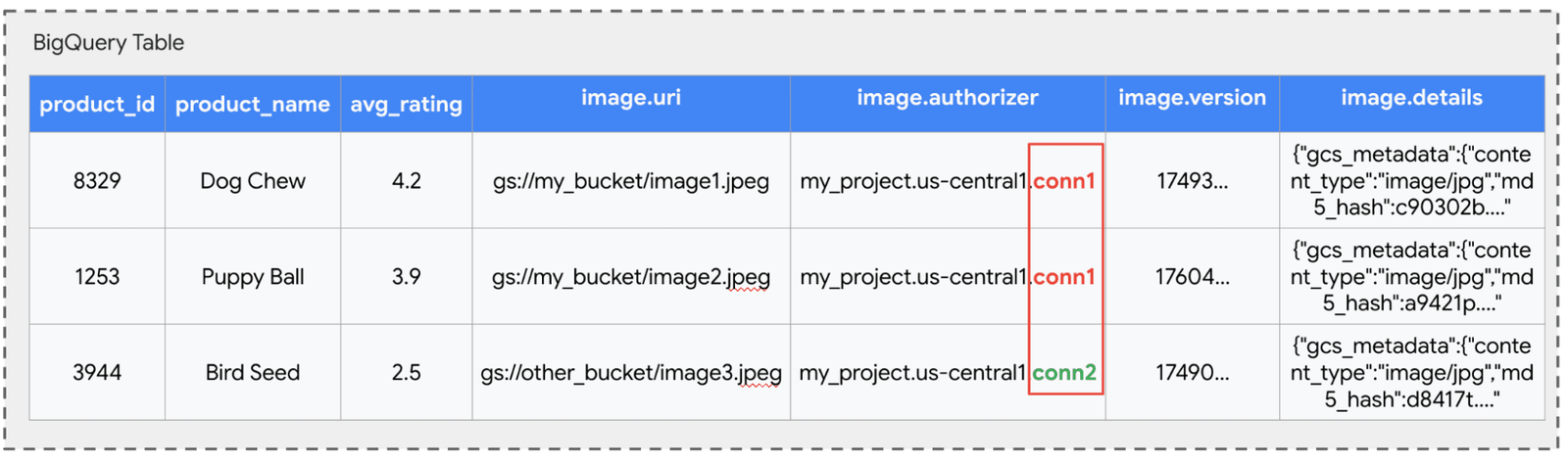 Cela permet à un administrateur de gérer les autorisations GCS de manière centralisée via des connexions. Par exemple, conn1 pourrait accéder à un seau d’image public, tandis que conn2 accède à un seau restreint avec de nouveaux conceptions de produits. Même si un utilisateur peut voir toutes les lignes, sa capacité à interroger le fichier sous-jacent pour le produit «graine d’oiseau» dépend entièrement de savoir s’il a la permission d’utiliser les plus privilégiés conn2 connexion.